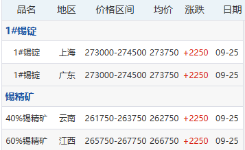 9月25日各地区现货锡价格