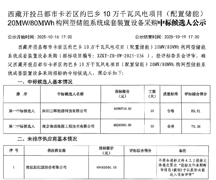 北极星储能网获悉,10月16日,西藏开投昌都市卡若区约巴乡10万千瓦风电项目(配置储能)20MW180MWh构网型储能系统成套装置设备采购中标候选人公示。
