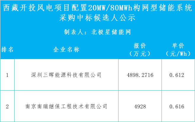 第一中标候选人为深圳三晖能源科技有限公司,投标报价4898.2716万元,折合单价0.612元/Wh;
