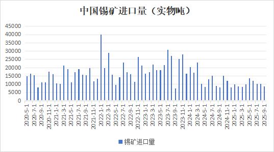 据最新海关总署数据显示,中国2025年9月锡矿砂及其精矿进口量8713.60实物吨(折合约3444.62金属吨)同比下降11.87%,环比下降26.59%,创年内新低。1-9月累计进口约9.14万实物吨,月累计同比下降0.11%。