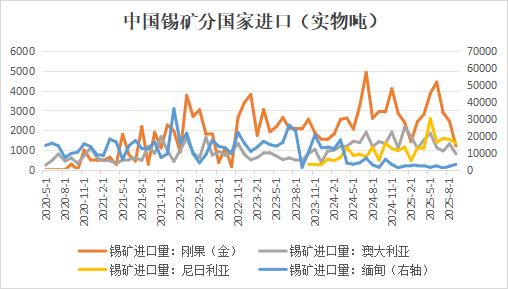 从进口减量的原因来看,刚果(金)与澳大利亚的情况较为相似。这两个国家当地的锡矿出货量及装运量并未出现明显下降,进口数据的环比下滑主要因部分海上运输货物受船运因素影响,延期至 10 月初才抵达国内港口完成报关,导致 9 月实际到港量减少。尼日利亚方面,尽管 9 月进口量有小幅回落,但该国当前锡矿开发进度保持稳定,后续产量大概率维持现有水平,不过雨季对开采与运输环节可能产生的影响仍需重点跟踪。