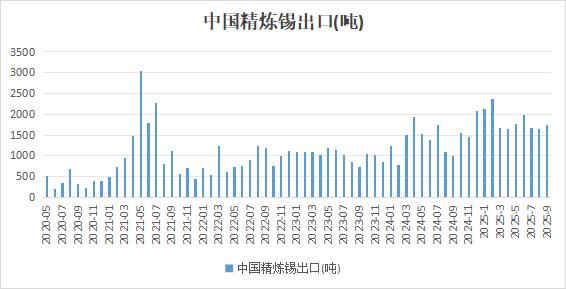 中国9月出口精锡1749吨,同比增加76.77%,环比增加6.65%。2025年1-9月中国锡锭出口总量16618吨,同比增37%。