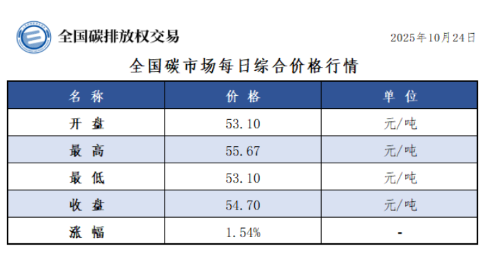 今日全国碳市场综合价格行情为: 开盘价53.10元/吨,最高价55.67元/吨,最低价53.10元/吨,收盘价54.70元/吨,收盘价较前一日上涨1.54%。