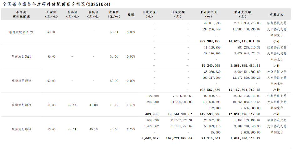 截至2025年10月24日,全国碳市场碳排放配额累计成交量749,024,596吨,累计成交额50,826,698,555.21元。