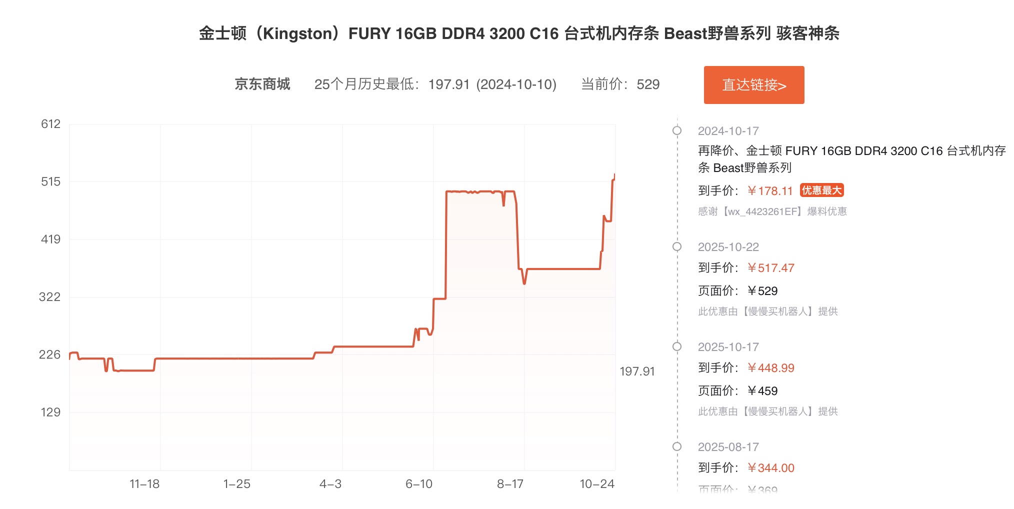 多位模组厂人士向记者表示,从今年一季度开始,DDR4的原厂价格持续走高。根据慢慢买App,一款金士顿(Kingston)的DDR4台式机内存条,价格从今年3月开始急速上涨,目前售价已超去年同期两倍。