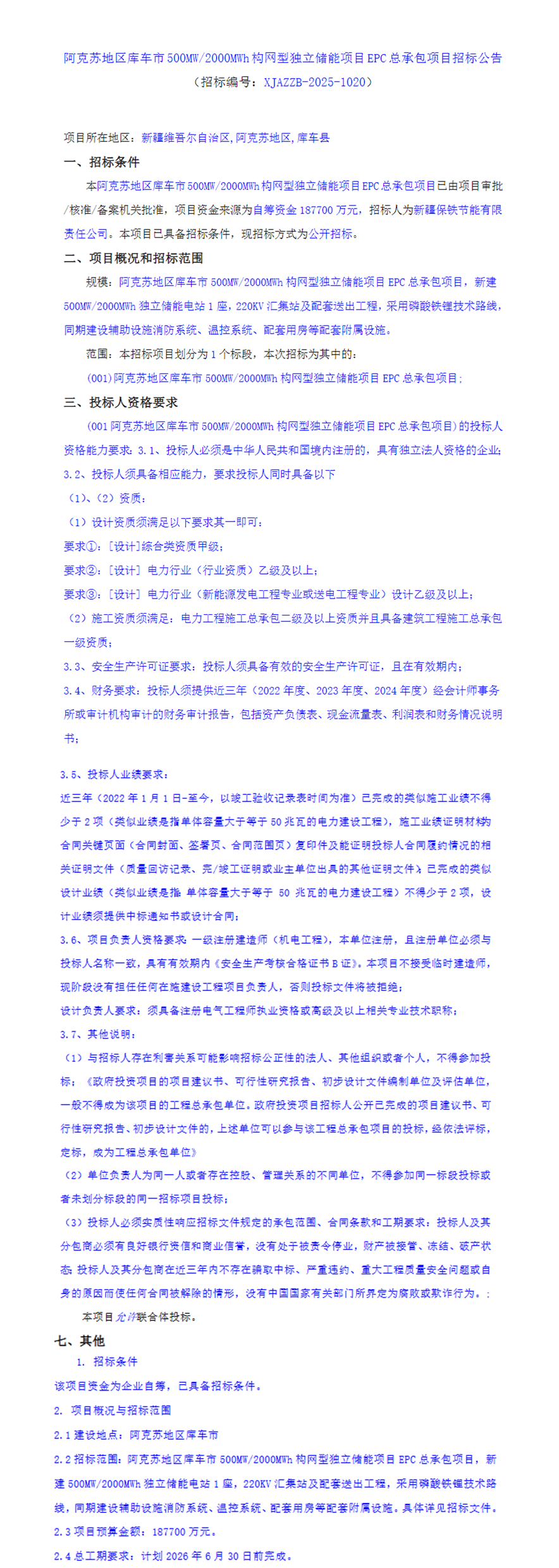 北极星储能网讯:2025年10月24日,新疆保铁节能有限责任公司公开招标500MW/2GWh构网型独立储能EPC项目,项目位于新疆维吾尔自治区阿克苏地区库车县,项目资金来源为自筹资金187700万元,单价约合0.9385元/Wh。
