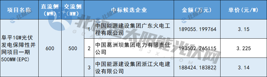 10月24日,阜平1GW光伏发电保障性并网项目一期500MW(EPC)工程总承包中标候选人公示,第一中标候选人为中国能源建设集团广东火电工程有限公司,单价为3.15元/W。该项目投标单价为3.14~3.225元/W。详情如下: