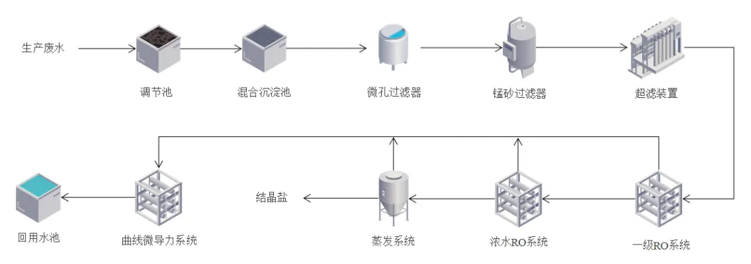 钠法制取磷酸铁工艺所产生的酸性废水,以硫酸根(SO₄²⁻)与钠离子(Na⁺)为主,并含有少量氯离子、钙镁离子。相较于氨法工艺,其废水总量显著减少。针对该废水特性,处理系统以资源回收与分级回用为核心目标,结晶出盐以硫酸钠为产品,回用水根据用水需求可处理电导率<10μS/cm满足生产工艺用水要求,也可电导率<1000μS/cm满足循环水补水要求。