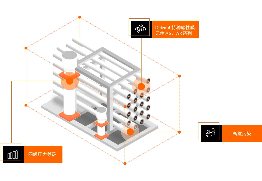 莱特莱德自研靶向耐酸分离净化系统,相比传统处理工艺路线更短,无需投加药剂,极大节约运行成本。靶向酸分离膜系统结合耐酸膜元件的特性,可在酸性工况下利用耐酸膜进行酸纯化浓缩,实现对产水酸净化处理,及浓水浓缩减量,实现酸的分离纯化。靶向酸分离膜系统所使用的Delemil酸液提取分离膜对COD、重金属离子等污染因子同样具有高倍率的截留效果,并且基于膜元件的PON耐污染技术和POM宽流道高架桥旁路技术,使系统具有更高的抗污染性能,且平行宽流道降低了系统能耗。