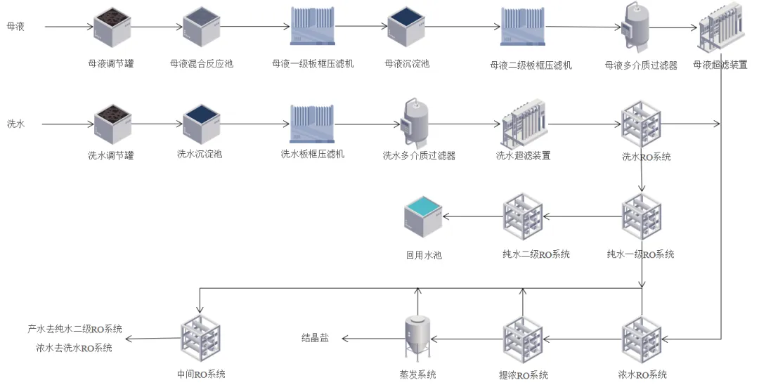 氨法制取磷酸铁过程中产生的酸性废水(包括母液与洗水),其特点是富含铵根(NH₄⁺)、硫酸根(SO₄²⁻)和磷酸根(PO₄³⁻),并含少量铁锰离子、钙镁离子。为实现资源化与近零排放,处理效果结晶出盐以硫酸铵为产品,硫酸铵、磷酸一铵为混盐,回用水满足电导率<10μS/cm。