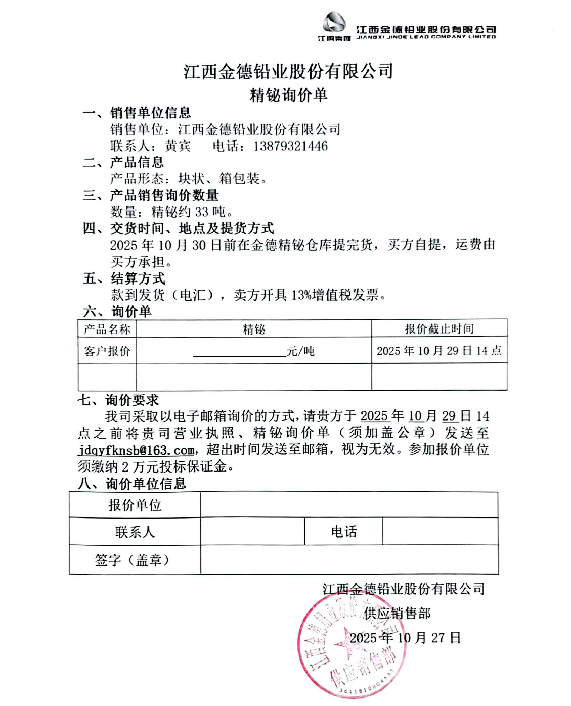近期,江西金德铅业股份有限公司发布询价单,销售精铋数量约33吨,要求2025年10月30日前在金德精铋仓库提完货,买方自提,运费由买方承担。