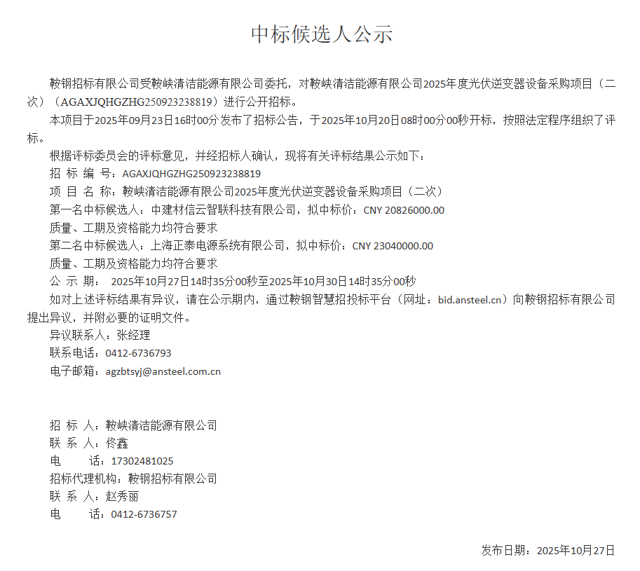 10月27日,鞍峡清洁能源有限公司2025年度光伏逆变器设备采购项目(二次)中标候选人公示,第一名中标候选人中建材信云智联科技有限公司,拟中标价20826000元;第二名中标候选人上海正泰电源系统有限公司,拟中标价23040000元。