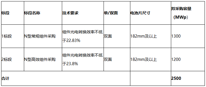本项目共设2个标段,分别采购N型常规组件采购,预估采购总容量约2500MWp。