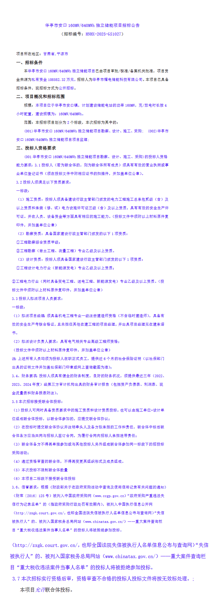 (001)华亭市安口 160MW/640Mwh 独立储能项目勘察、设计、施工、采购;(002)华亭市安口 160MW/640MWh 独立储能项目项目监理