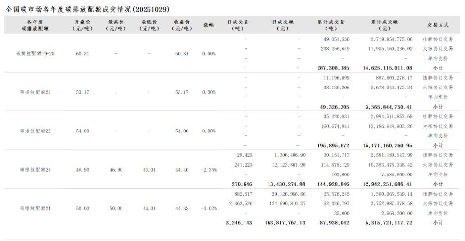 截至2025年10月29日,全国碳市场碳排放配额累计成交量765,397,050吨,累计成交额51,620,093,326.57元。