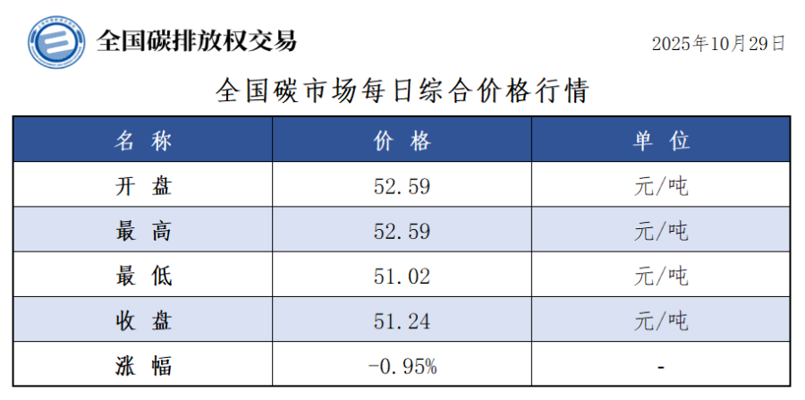 今日全国碳市场综合价格行情为: 开盘价52.59元/吨,最高价52.59元/吨,最低价51.02元/吨,收盘价51.24元/吨,收盘价较前一日下跌0.95%。