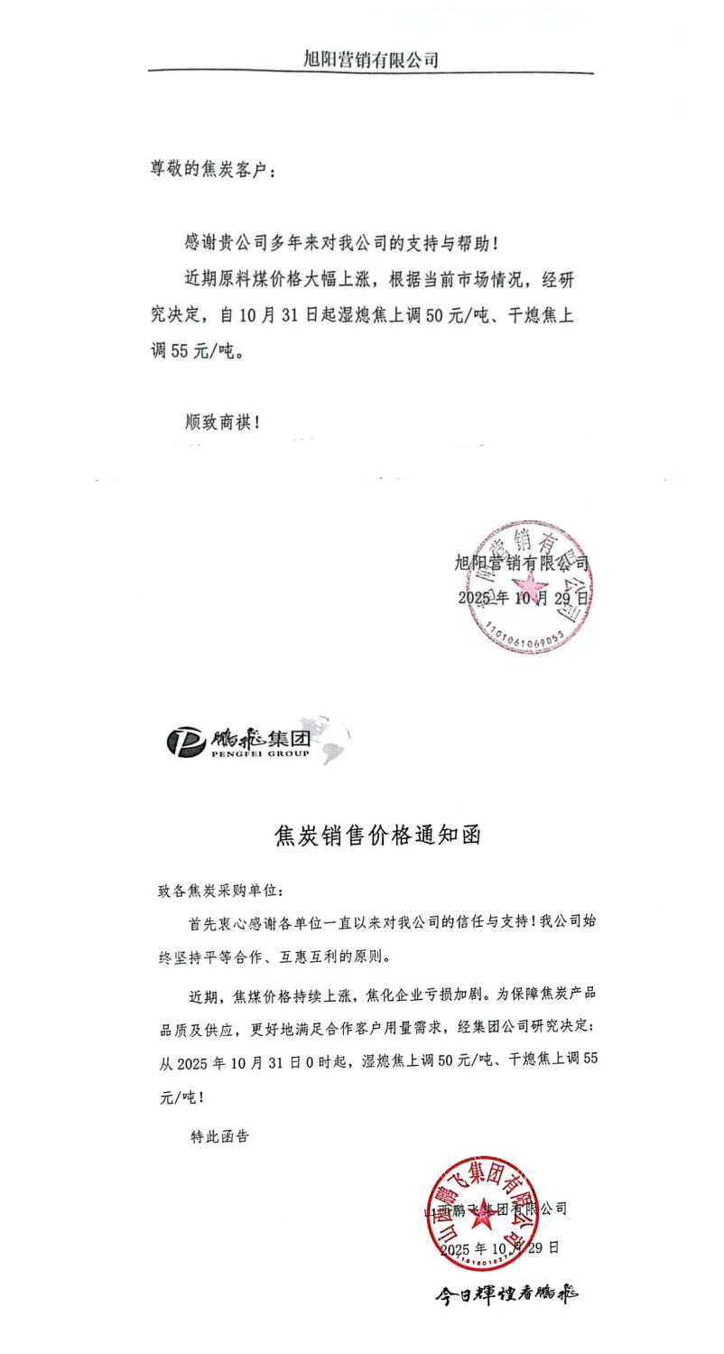 知情人士告诉记者,10月29日上午,多地的重点焦化企业代表召开专题市场分析会。与会焦化企业达成以下共识:一是自10月31日零时起,对钢厂客户执行捣固湿熄焦价格上调50元/吨,捣固干熄焦价格上调55元/吨,顶装湿熄焦价格上调70元/吨,顶装干熄焦价格上调75元/吨。二是全体焦化企业坚持“亏损少生产、亏损不销售、不赊销”的原则,坚决维护行业合理利润水平和健康发展秩序。