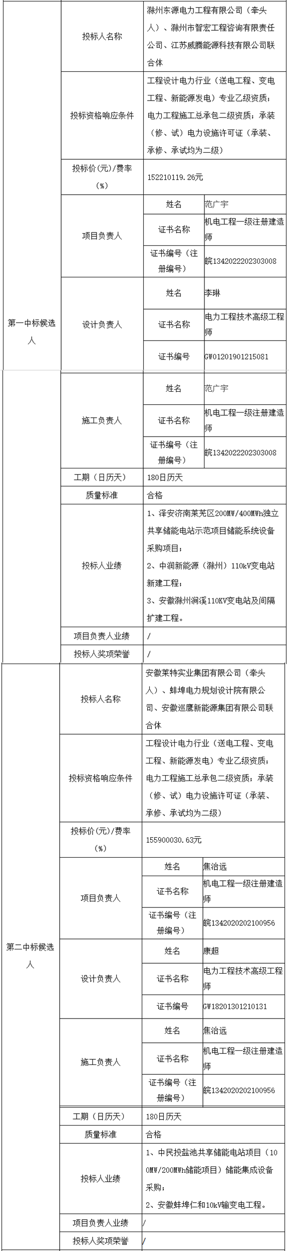 第一中标候选人为滁州东源电力工程有限公司(牵头人)、滁州市智宏工程咨询有限责任公司、江苏威腾能源科技有限公司联合体,投标报价15221.011926万元,折合单价0.7611元/Wh;