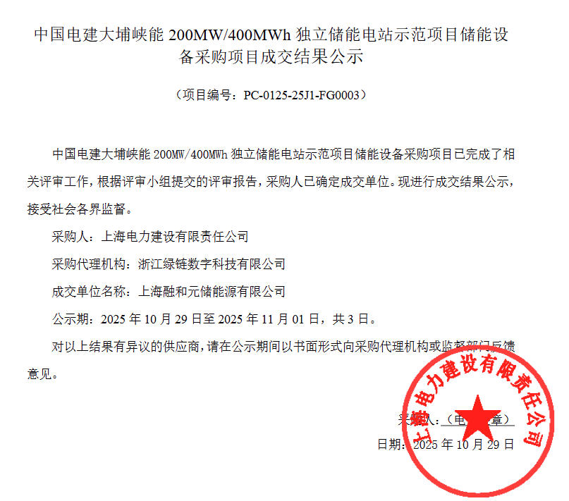 北极星储能网获悉,10月29日,中国电建大埔峡能200MW/400MWh独立储能电站示范项目储能设备采购项目成交结果公示,上海融和元储能源有限公司中标该项目。