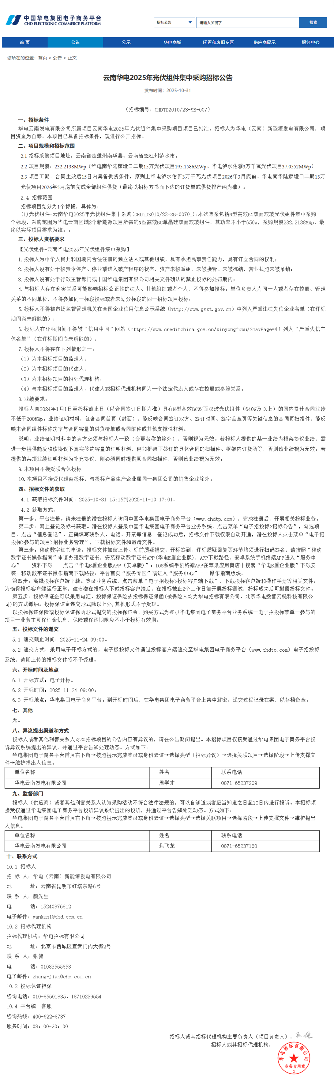 10月31日,云南华电2025年光伏组件集中采购发布,本次集采包括N型高效BC双面双玻光伏组件集中采购一个标段,采购范围为华电云南区域2个新能源项目所需的N型高效BC单晶硅双面双玻组件,其功率不小于650W。
