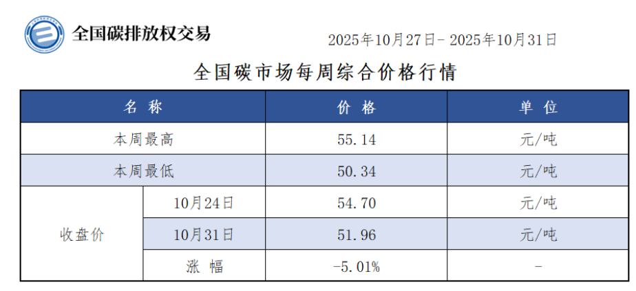 本周全国碳市场综合价格行情为:最高价55.14元/吨,最低价50.34元/吨,收盘价较上周五下跌5.01%。