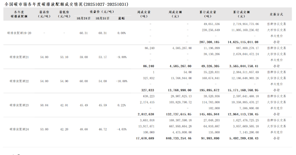 截至2025年10月31日,全国碳市场碳排放配额累计成交量769,929,996吨,累计成交额51,818,523,691.32元。