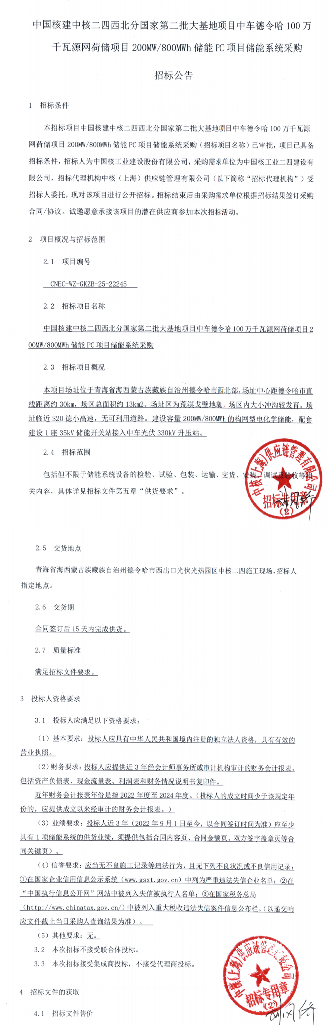 北极星储能网讯:2025年12月3日,中核集团发布中国核建中核二四西北分国家第二批大基地项目中车德令哈100万千瓦源网荷储项目200MW/800MWh储能PC项目储能系统采购招标公告。