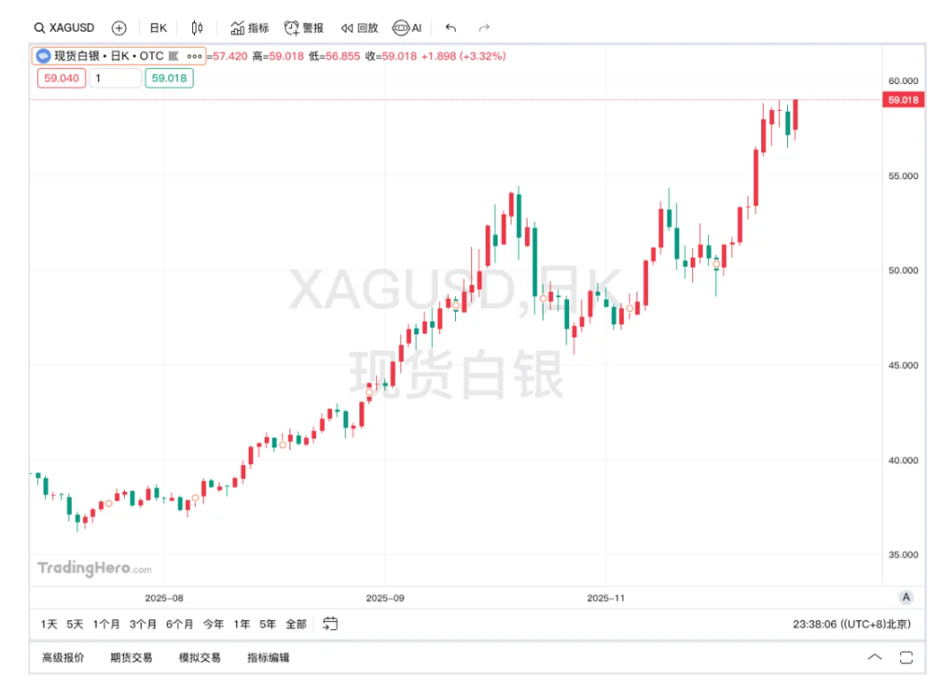 周五深夜,现货白银价格向上触及59美元/盎司,大涨3.5%,再创历史新高,今年累计涨幅已超过100%。COMEX白银期货价格日内大涨4%,报59.80美元/盎司。