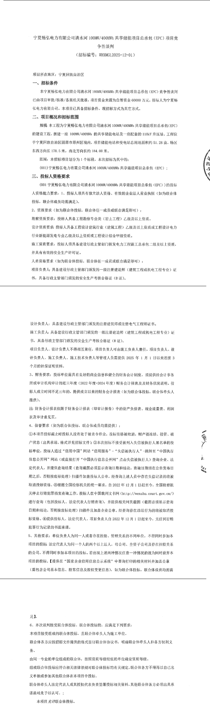 12月6日,宁夏畅弘电力有限公司清水河100MW/400MWh共享储能项目总承包(EPC)竞争性谈判正式启动,该项目已完成审批备案,具备招标条件。