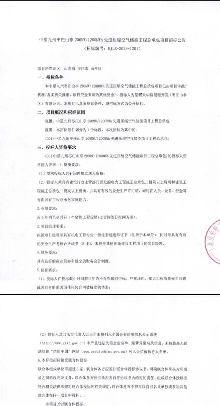 12月7日,中星九州枣庄山亭200MW/1200MWh先进压缩空气储能工程总承包项目启动公开招标,招标人为星耀天华新能源开发(枣庄山亭区)有限公司。