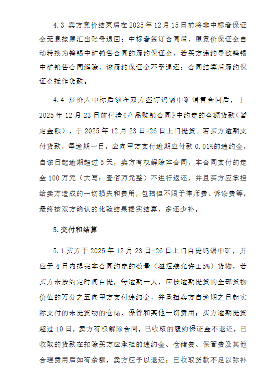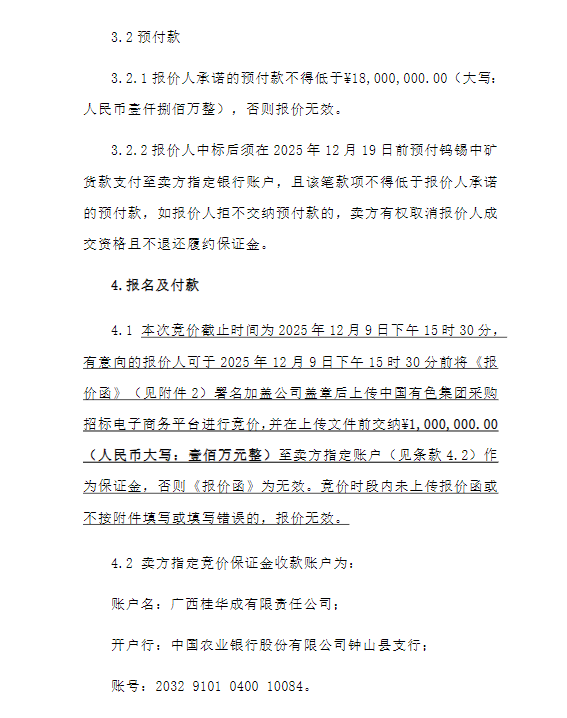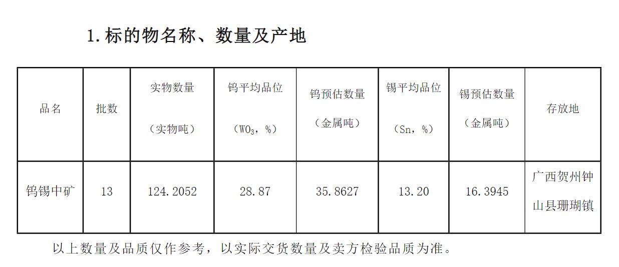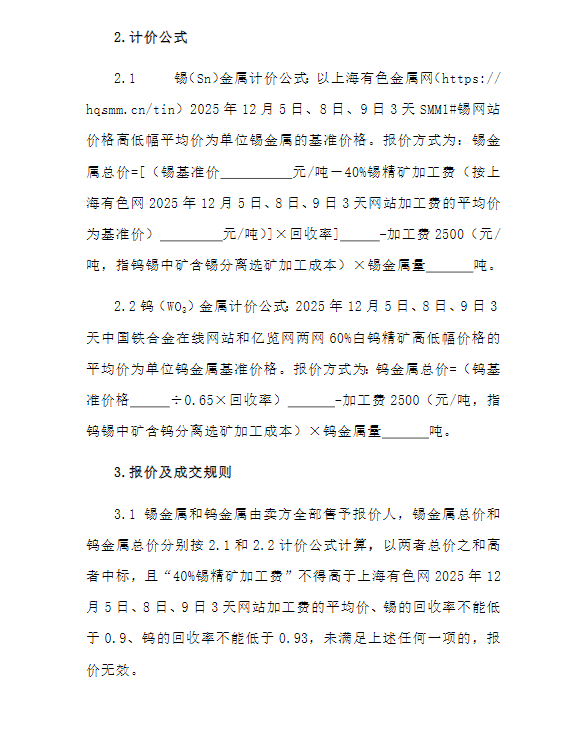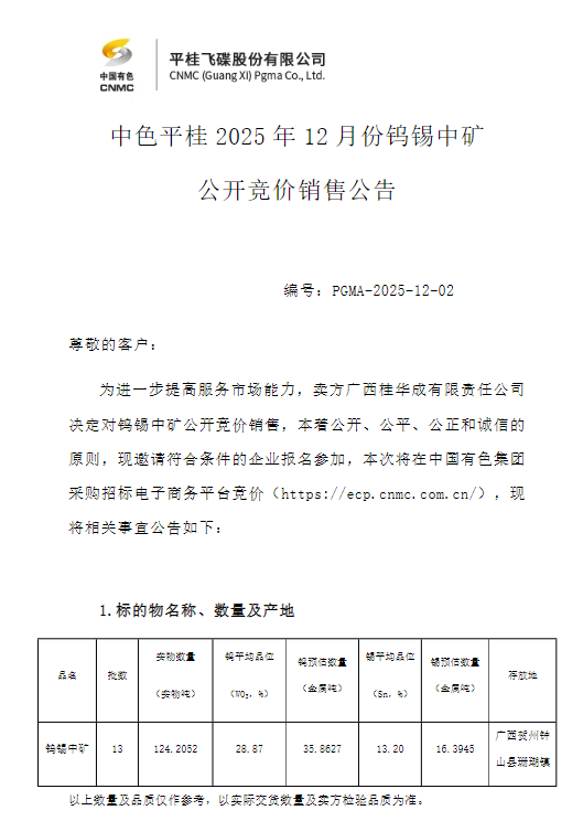 中色平桂2025年12月份钨锡中矿公开竞价销售竞价公告