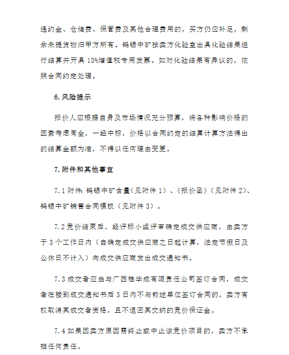 广西一矿山竞价招标销售钨锡中矿约124.2052实物吨(钨品位约为28.87%,锡品位约为13.2%),竞价截止时间为2025年 12 月 9 日下午 15 时 30 分整。有意向者请联系白先生:188-7749-6428,或登录网站了解详情及参与投标,以网站竞价文件为准。