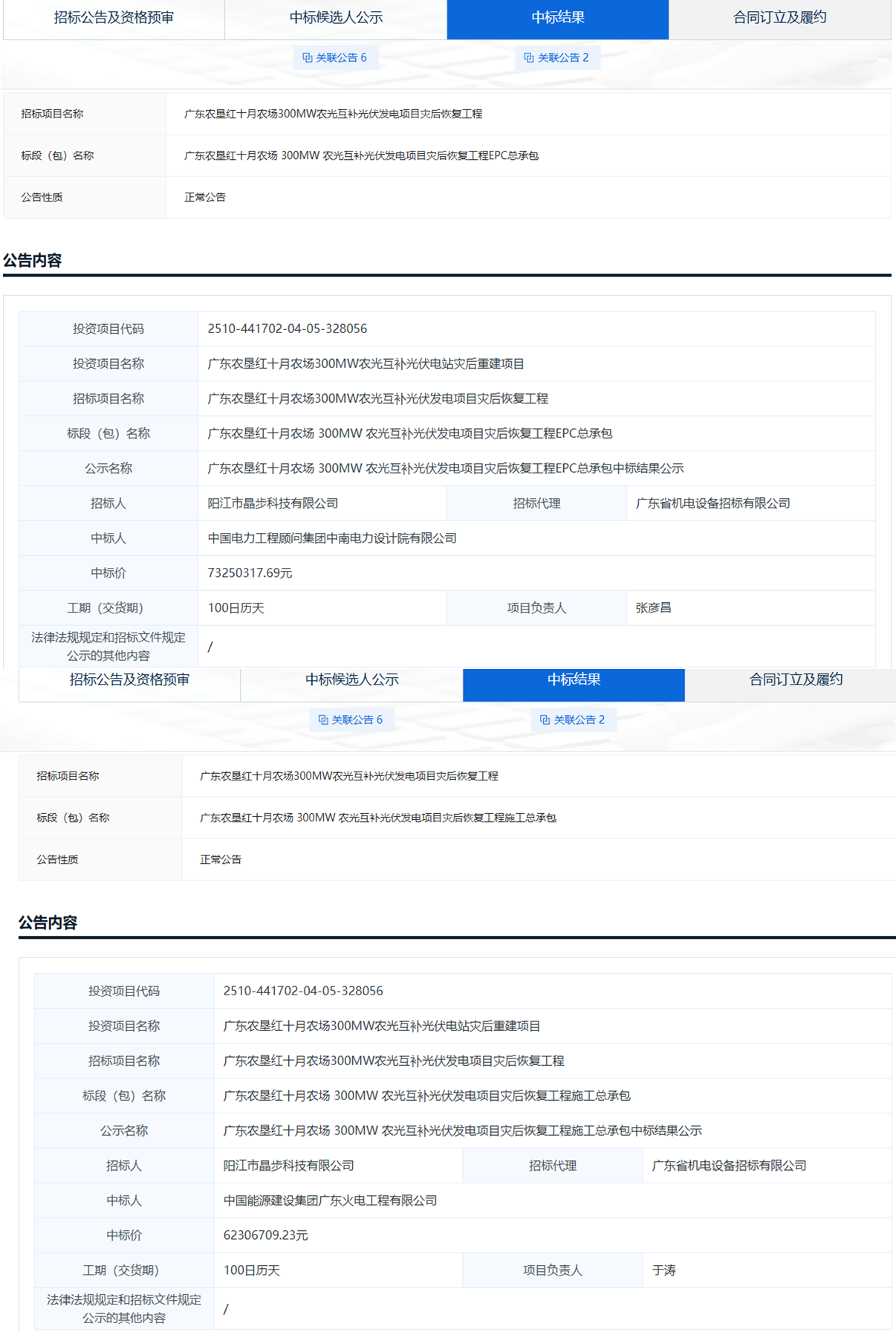 12月9日,广东农垦红十月农场300MW农光互补光伏发电项目灾后恢复工程EPC总承包中标结果公布,项目分为两个标段,标段1中标人为中国电力工程顾问集团中南电力设计院有限公司,中标价格7325.031769万元,单价0.488元/W;标段2中标人为中国能源建设集团广东火电工程有限公司,中标价格6230.670923万元,单价0.415元/W。