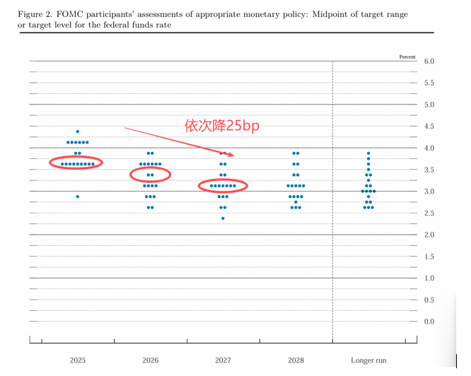 简单来说,点阵图是一张由许多小点组成的散点图:横轴代表时间,比如2025年、2026年以及“长期”;纵轴则代表利率水平。图上的每一个点,都代表一位美联储官员对特定年份年底时,认为的“合理”利率水平是多少。