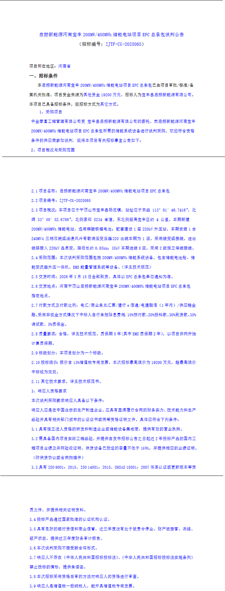 12月9日,启赫新能源河南宝丰200MW/400MWh储能电站项目EPC总承包谈判采购公告发布,此次采购由中金泰富工程管理有限公司受宝丰县启赫新能源有限公司委托组织,项目资金来源为其他资金,总额19200万元。