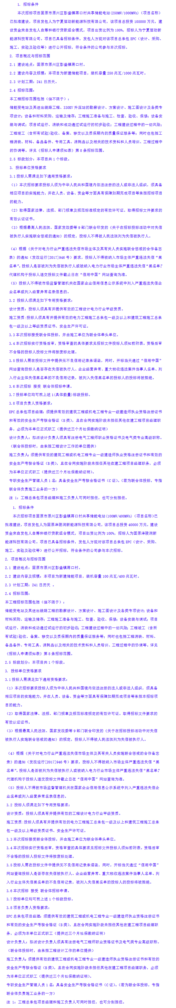 两个项目均位于宁夏固原市原州区彭堡镇蒋口村,为新建储能电站,计划工期均为241日历天。