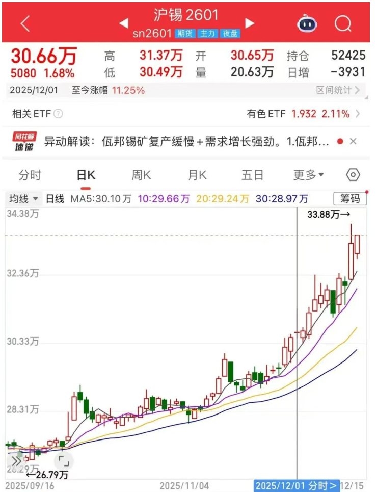 “2025年全年锡价都呈现震荡上行态势,9月末加速上涨,如今更是站上了33万元/吨关口。”方正中期有色金属分析师胡彬告诉期货日报记者,全年锡价整体上行趋势较为流畅,刚果(金)内乱、缅甸佤邦复产等消息交替影响市场,而9月末印尼打击非法锡矿走私导致精锡出口量下滑,加剧了市场对供应的担忧。