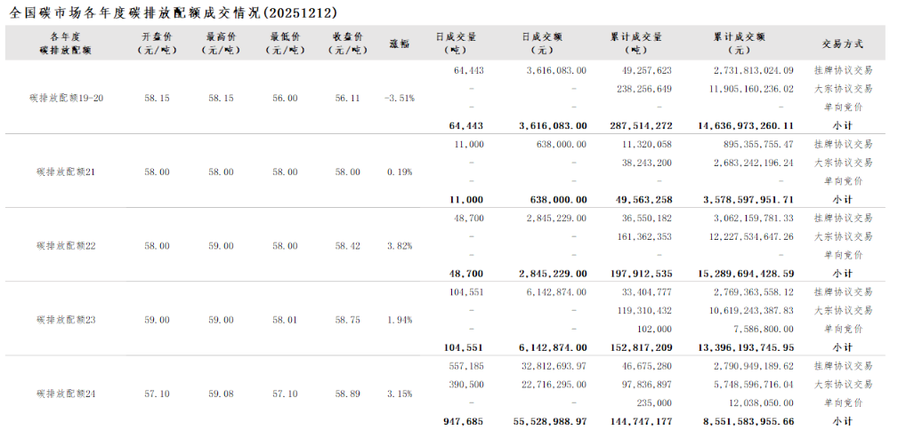 截至2025年12月12日,全国碳市场碳排放配额累计成交量832,554,451吨,累计成交额55,453,043,342.02元。