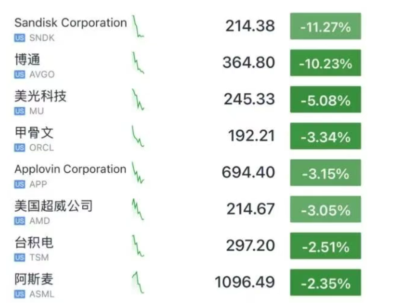 消息面上,据媒体报道,甲骨文已将为OpenAI开发的部分数据中心完工日期从2027年推迟至2028年。这一消息叠加博通与甲骨文财报不及预期,投资者对AI热潮的担忧再度加剧,美股科技股承压,多家AI概念的科技巨头股价纷纷下挫。继甲骨文股价周四暴跌后,博通股价也成为关注焦点,跌幅约为10%。