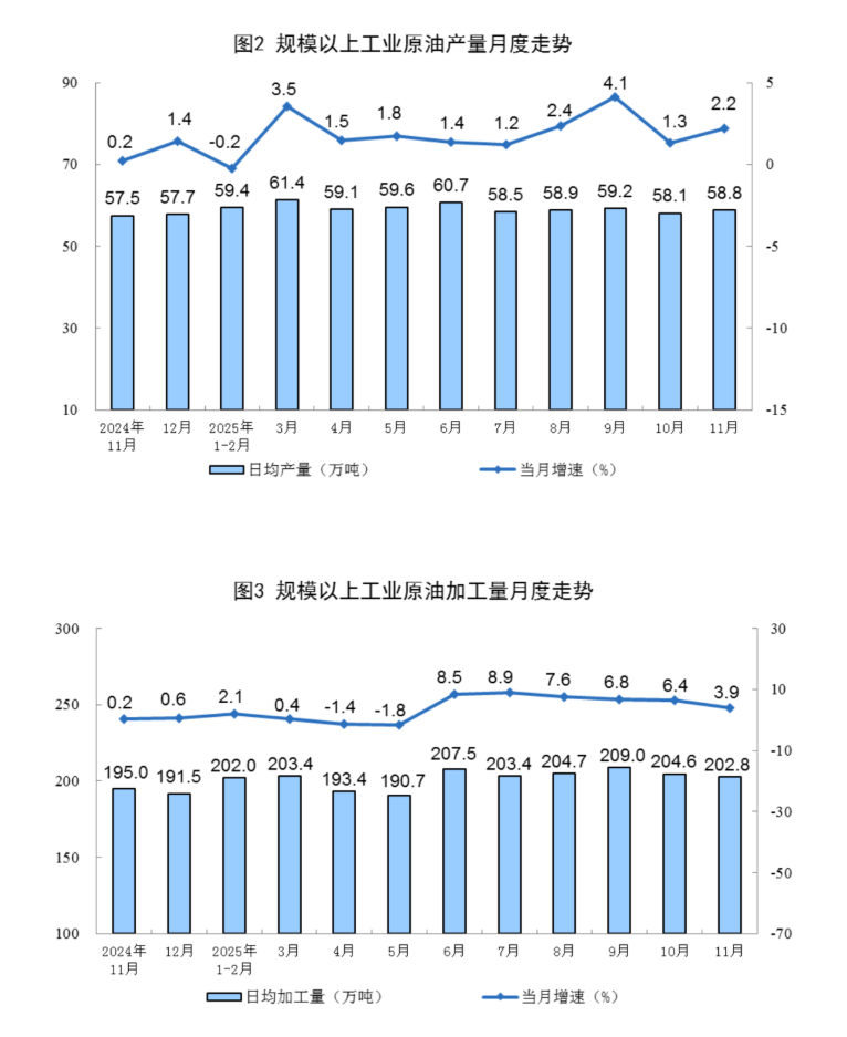 原油生产增速加快。11月份,规上工业原油产量1763万吨,同比增长2.2%,增速比10月份加快0.9个百分点;日均产量58.8万吨。