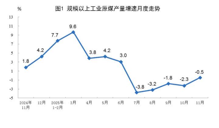 1—11月份,规上工业原煤产量44.0亿吨,同比增长1.4%。