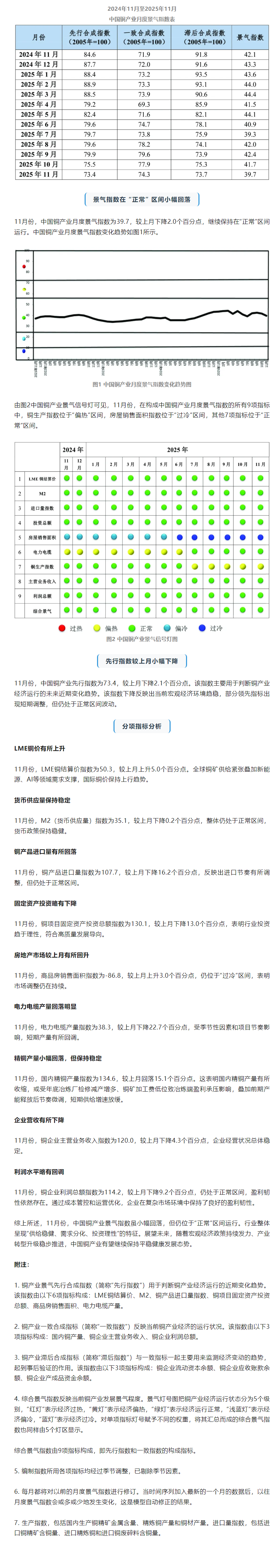 中国铜产业月度景气指数监测模型结果显示,2025年11月,中国铜产业景气指数为39.7,较上月下降2.0个百分点,继续保持在“正常”区间运行;先行指数为73.4,较上月下降2.1个百分点;一致指数为74.3,较上月下降3.6个百分点。最近13个月中国铜产业月度景气指数见下表。