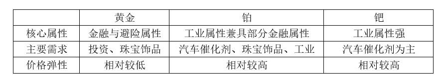 但同时,黄金和铂钯的差异性也较为明显,主要在于根本属性不同。从金融属性来看,黄金>铂>钯,而从工业属性来看正好相反,钯>铂>黄金。