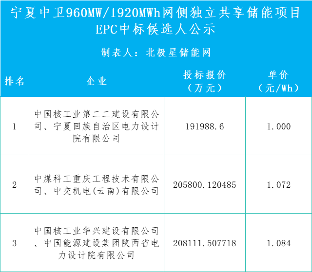 第一中标候选人为中国核工业第二二建设有限公司、宁夏回族自治区电力设计院有限公司联合体,投标报价191988.6万元,折合单价1.000元/Wh;