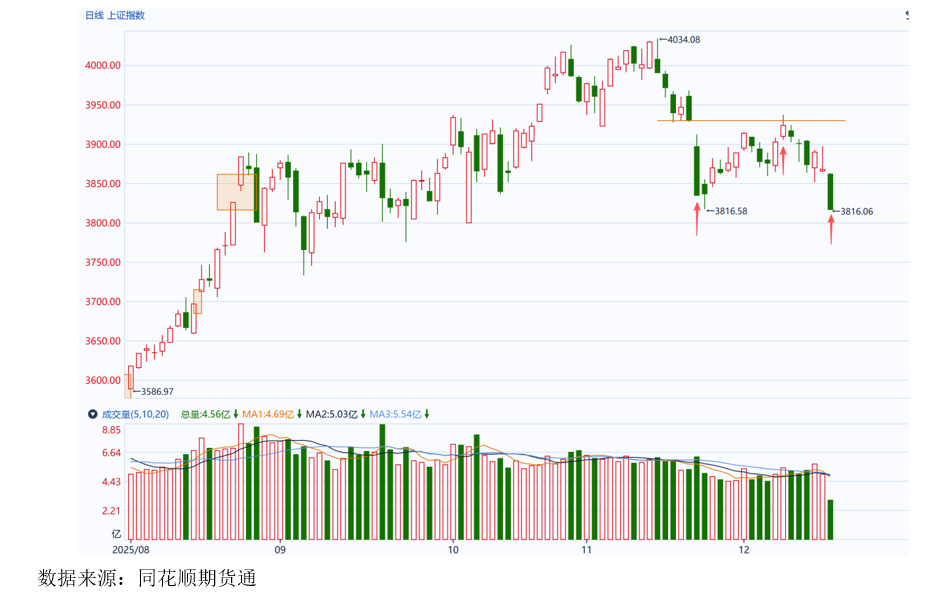 首先,我们来看一看上证指数目前的盘面表现:上证指数自11月21日以向下跳空缺口发出首个技术转弱信号后,虽于12月8日反抽尝试回补缺口,但最终承压回落。此后指数持续走低,并于今日再度收阴,跌破一个月前形成的低点。