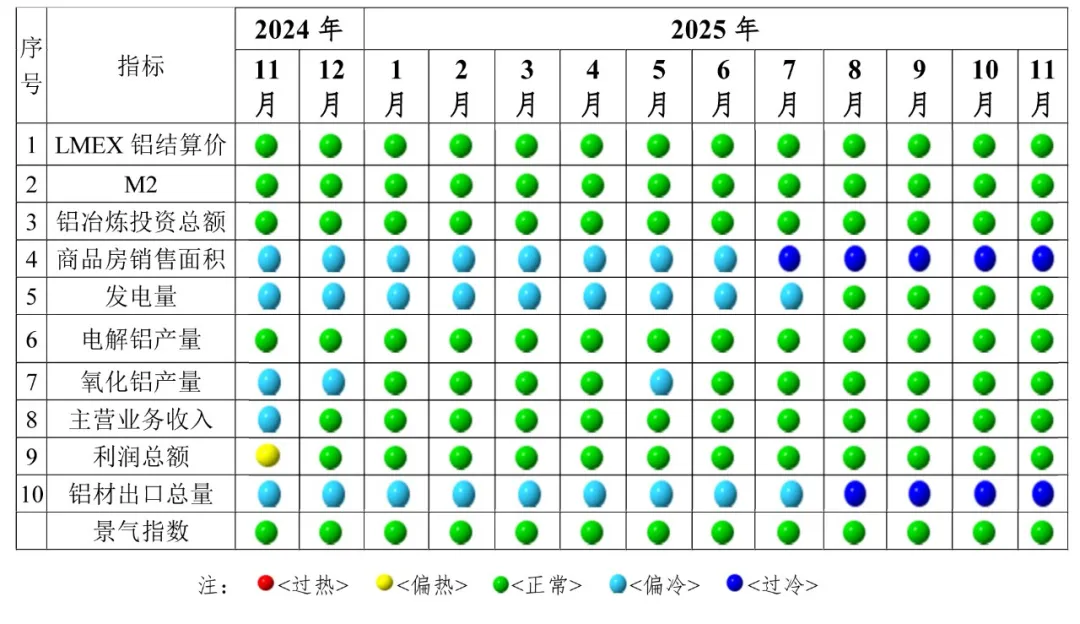 综上所述,11月份,中国铝冶炼产业景气指数延续回升态势,一致指数改善明显,反映当前行业运行稳健、效益提升。尽管先行指数略有回落,铝材出口仍面临压力,但在国内宏观经济政策支持、产业结构持续优化、企业盈利改善的多重利好下,预计铝冶炼行业将继续在“正常”区间平稳运行。