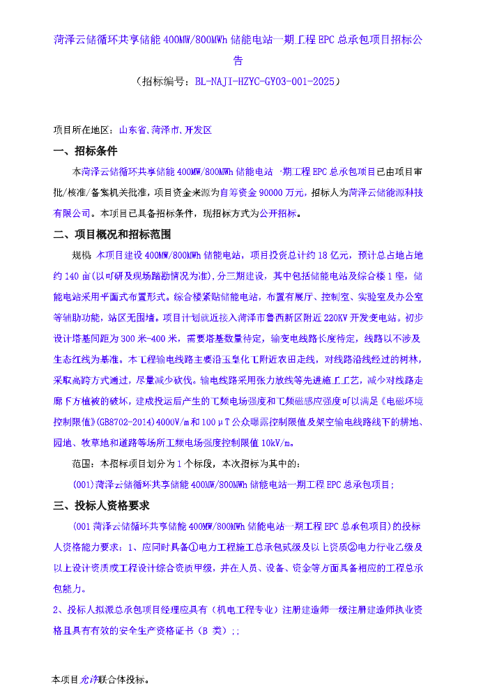 北极星储能网,12月15日,菏泽云储循环共享储能400MW/800MWh储能电站一期工程EPC总承包项目招标公告发布。