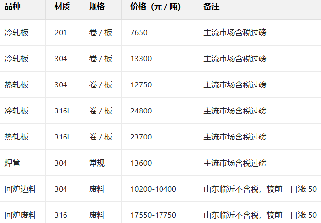 12月30日国内主流不锈钢现货价格