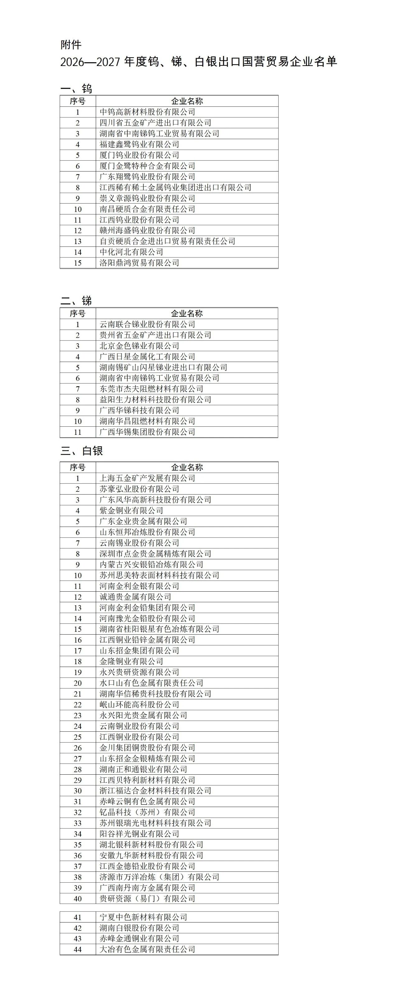 根据《中华人民共和国对外贸易法》和《中华人民共和国货物进出口管理条例》,现公布2026—2027年度钨、锑、白银出口国营贸易企业名单,请通知至相关企业。