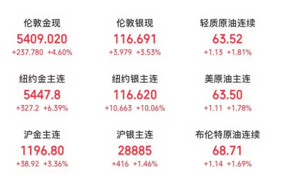 今天凌晨,国际金价再创历史新高。截至发稿,伦敦金现货价格收涨4.6%,报5409.2美元/盎司,盘中最高涨至5417.82美元/盎司。纽约期金主力合约涨逾6%。